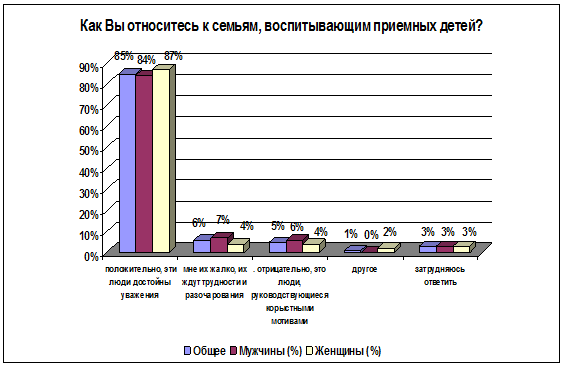 Отношение к семьям, воспитывающим приемных детей, носит выраженный позитивный характер (Приложение 5). Большинство респондентов (85%) положительно относятся к семьям, воспитывающим приемных детей, при чем значимых расхождений между мужчинами и женщинами нет. 6% респондентов считают, что семьи обречены на трудности и разочарования, а 5% сделали вывод, что эти люди руководствуются корыстными целями. В варианте "Другое" были и такие ответы: «если ребенок попал в хорошую семью, то положительно», «положительно, если будут любить, как собственного ребенка».