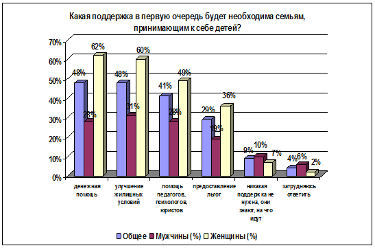 На вопрос анкеты о «поддержке семей, принимающих к себе детей», респонденты могли выделить несколько вариантов ответа (Приложение 6). Равное количество, 48% респондентов, считает, что семьи, берущие на себя заботу о детях-сиротах, нуждаются в денежной помощи и улучшении жилищных условий. Среди тех, кто выбрал эти варианты ответа, преобладают женщины (62% и 60% соответственно), 36% женщин так же отмечают необходимость предоставления льгот. 49% опрошенных женщин обращают внимание на то, что семьям, принимающим к себе детей, необходима квалифицированная педагогическая, психологическая, правовая помощь, среди мужчин этот показатель почти в два раза ниже, 9% респондентов уверены, что вообще никакая поддержка не нужна, так как люди знают, на что идут.