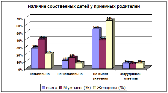На вопрос о наличии или отсутствии собственных детей у приемных родителей (Приложение 7) были получены следующие ответы: для 28% респондентов наличие собственных детей у приемных родителей (воспитателей) представляется желательным, при чем среди мужчин этот ответ встречается в два раза чаще. Наличие собственных детей у приемных родителей не имеет значения для 54% опрошенных, 11% считают, что собственных детей иметь нежелательно, так как приемным детям достанется меньше любви, заботы и внимания.