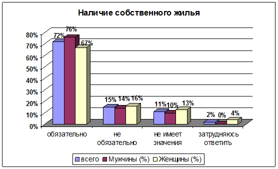 Что касается требований к наличию собственного жилья, то подавляющее большинство респондентов (72%) настаивает на его необходимости (Приложение 8).