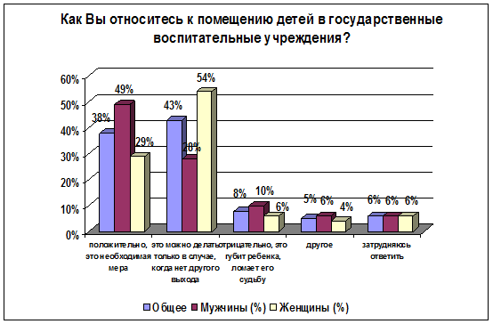 На вопрос «Как Вы относитесь к помещению детей в государственные воспитательные учреждения?» ответы распределились следующим образом: значительное число респондентов (43%) исходит из того, что помещение ребенка в детский дом возможно только в крайнем случае, когда нет другого выхода. Такую точку зрения высказали большинство женщин – 54%, а вот 49% мужчин считают, что это необходимая мера. Вариант «Отрицательно, это губит ребенка, ломает его судьбу» выбрали лишь 8% респондентов. В варианте «Другое» высказывается мысль о том, что детский дом - это реальная помощь, средство спасения детей, но указывается необходимость улучшения условий жизни в детских домах (Приложение 9).