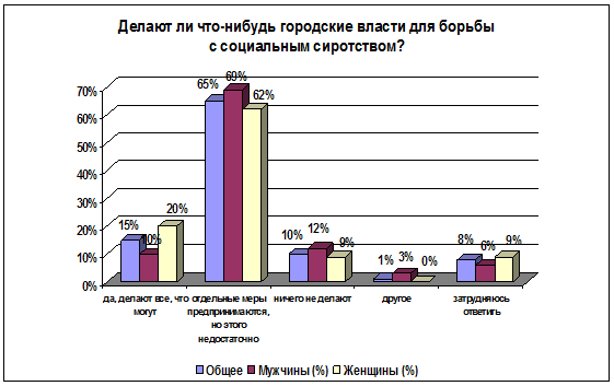 В анкете было также предложено оценить деятельность городских властей по решению проблем социального сиротства (Приложение 11). Анализируя ответы, можно сделать вывод о том, что количество людей, позитивно оценивающих деятельность городских властей по решению проблем социального сиротства, относительно невелико (15%) и среди них преобладают женщины (процентный показатель в два раза больше, чем у мужчин). 10% опрошенных считают, что городские власти «ничего не делают». Большинство респондентов (65%) придерживается варианта «отдельные меры предпринимаются, но этого недостаточно». В немалой степени существование такого мнения объясняется слабой информированностью населения о деятельности в этой области социальных служб, воспитательных учреждений, городской администрации.