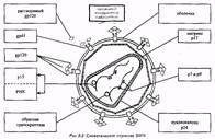 ВИЧ включает две основные структуры — оболочку и нуклеоид/нуклеокапсид (сердцевинную часть) (рис.2), Оболочка вируса представляет собой фрагмент мембраны (наружной или эндоплазматического ретикулума) клетки-хозяина, в которой был собран вирион. Липидный слой несет в себе гликопротеин gp160*, состоящий из эпимембранной (наружной) части, обозначаемой gp120, и трансмембранной части — gp41. Трансмембранный протеин gp41, расположенный непосредственно в оболочке вируса, соединяется дисульфидными связями с несколькими (от 3 до 6) молекулами gp120. Некоторое количество гликопротеина gp120 произвольно отделяется от вириона и попадает в кровь и ткани организма в виде растворимой субстанции. Внутри под оболочкой находится матриксный каркас, состоящий из белка р17/18**.