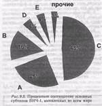 Основная группа М (от англ, major - основной) на сегодня доминирует в мире [2]. Она в свою очередь подразделяется на субтипы, обозначаемые буквами латинского алфавита от А до Н. Варианты ВИЧ этой группы встречаются во всех странах. География распространения субтипов следующая. В Африке — колыбели ВИЧ - выявлены все субтипы. В Европе и Северной Америке превалирует субтип В, в Юго-Восточной Азии - субтип Е, в Индии — субтип С. В целом в мире наблюдается следующая частота выделения субтипов ВИЧ у инфицированных лиц (рис.3).