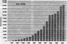 Согласно данным CDC, в США к концу 1990 г. было зарегистрировано 160 тыс. больных СПИДом (рис.4). В Западной Европе СПИД встречается реже, однако в Восточной и Центральной Африке положение значительно хуже: согласно оценкам, от 10 до 20% взрослых африканцев заражены вирусом иммунодефицита (Pekkanen, 1989; Eckholm, Tierney, 1990). Кроме того, из регионов, прежде казавшихся не захваченными этой инфекцией, теперь поступают сведения о повышении ее частоты. Например, в Таиланде ВИЧ-инфекция распространяется невиданными темпами: в Бангкоке, где в конце 1987 г. вирусоносительство среди тех, кто вводит себе наркотики внутривенно, составляло 1%, к середине 1989 г. доля инфицированных достигла 40% (Mann, 1990). Увеличивается также число ВИЧ-инфицированных среди проституток