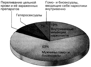 Как показано на рис. 5 среди первых 100 тыс. больных СПИДом в США 63% составляли гомо- и бисексуальные мужчины, которые не вводили себе наркотики внутривенно, 19% - гомо- и бисексуалы, практиковавшие внутривенное введение наркотиков, 7% - гетеросексуалы, партнеры которых были больны СПИДом или относились к группе высокого риска, а 3% - люди, заразившиеся при переливании крови или ее препаратов (MMWR 38:561-563, 1989). В Африке число больных СПИДом распределяется поровну между мужчинами и женщинами (Peterman, Curran, 1986). В других частях земного шара по мере расширения эпидемии ВИЧ в статистических данных происходят заметные сдвиги. Например, в Центральной и Южной Америке, где поначалу среди больных СПИДом преобладали мужчины (их было в 3-10 раз больше, чем женщин), это соотношение сильно изменилось, и в некоторых областях число больных мужчин и женщин сравнялось (Hilts, 1989). Хотя вначале СПИД считался болезнью, поражающей главным образом мужчин (гомо- и бисексуалов), теперь стало ясно, что гетеросексуальная передача - явление обычное и что не существует какой-то одной категории населения, которую можно было бы выделить как "группу риска" по этой болезни.
