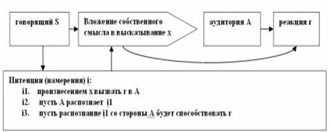 Говорящий S, (организатор пресс-конференции) вкладывая свой смысл (то, что он имеет в виду) в высказывание x, манифестирует (реализует) свои интенции, намерения: (i1) - он намерен произнесением x вызвать определённую реакцию r в аудитории (это коммуниканты – журналисты или партнеры) A; (i2) – он хочет, чтобы A распознала его намерение i1, а также (i3) - чтобы распознание намерения i1 со стороны А явилось основанием или частичным основанием для реакции r . Для успеха коммуникации необходимы все три типа интенций. (рисунок 1)[13]
