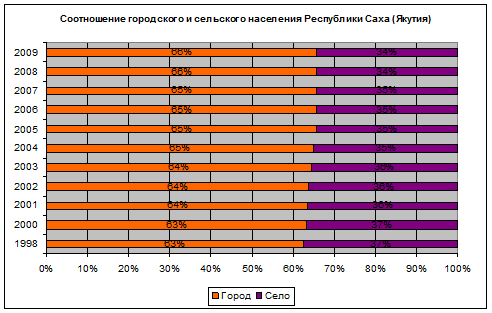 Городское население республики, на долю которого приходится 65,5% от общей численности населения, проживает в 13 городах и 42 поселках. Наибольшая доля городского населения (42,5%) сосредоточена в столице республики Якутске. Сельское население составляет 34,5% населения республики и проживает в 586 сельских населенных пунктах.