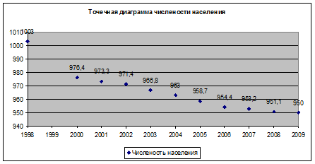 2. Исходя из проведенного регрессионного анализа выявлена общая тенденция уменьшения численности населения Республики Саха (Якутия). Так по линейному прогнозу к 2012 году численность предполагается 901,9 тыс. человек. Таким образом, в демографической политике в условиях структурной перестройки экономики необходимо предусмотреть меры по увеличению численности населения. В частности, наиболее эффективными методами являются снижение показателей смертности и повышение показателей рождаемости.