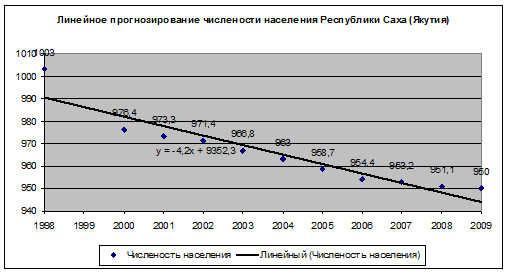 2. Исходя из проведенного регрессионного анализа численности населения выявлена общая тенденция уменьшения численности Республики Саха (Якутия). Так по линейному прогнозу к 2012 году численность предполагается 901,9 тыс. человек.