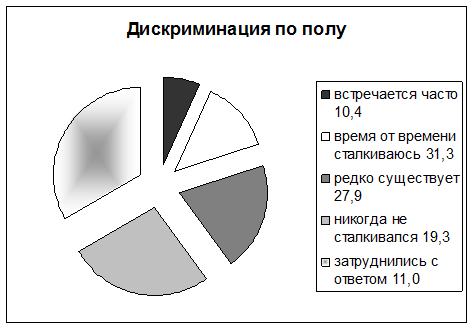 Дискриминацию при приеме на работу правильнее назвать скрытой , так как при отборе соискателей работодатель формально в качестве причины отказа указывает деловые качества, но в действительности отбор идет по половому или возрастному принципу. Таким образом, ст.3 Трудового кодекса РФ хотя и провозглашает запрещение дискриминации в сфере труда, но механизм реализации этого принципа отсутствует. Насколько серьезна эта проблема, мы видим из материала, предоставленного Клубом деловых и профессионально активных женщин Санкт-Петербурга, который осуществляют проект "Защита прав женщин на рынке труда". При официальном признании равенства мужчин и женщин, в России усиливаются дискриминационные тенденции в отношении женщин. Женщины постепенно вытесняются из престижных областей деятельности, понижается их статус и роль в обществе.