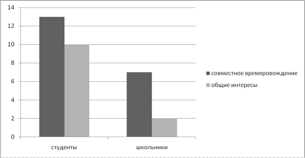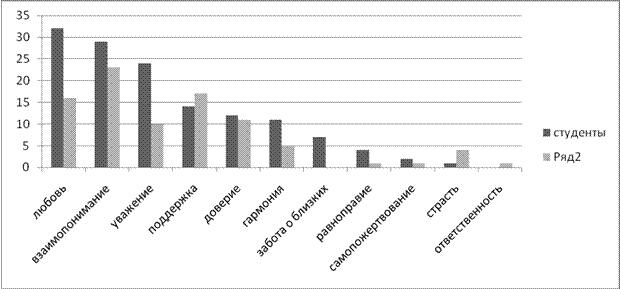 По рисунку №1 можно сделать такой вывод, что для студентов «любовь» важнее других семейных ценностей, а для школьников важнее «взаимопонимание». Такие ценности как уважение, доверие, поддержка, гармония являются обязательными в семейной жизни для студентов и для школьников. Такая ценность как «забота о близких» была указана только в сочинениях студентов, а в сочинениях школьников было указано такое качество как «ответственность».