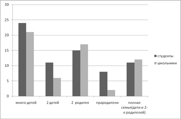 Из рисунка №2 следует, что как студенты, так и школьники считают, в «идеальной семье» должно быть много детей и двое родителей. Семья должна быть полной, целостной. Также учащиеся указали, что в семье должны присутствовать прародители.