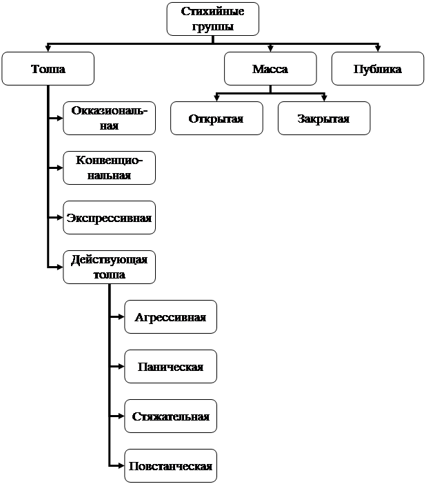 Группы о которых мы говорим возникают чаще всего стихийно, члены их не обязательно осознают свои цели, но активно действуют. Среди стихийных групп выделяют толпу, массу и публику.