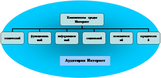 Среду Интернет рассматривают и как совокупность технических, функциональных, информационных, социальных, экономических, юридических компонентов, обеспечивающих существование, функционирование и деятельность индивидуальных и групповых пользователей, составляющих аудиторию Интернет (рис.1.3). Некоторые ученые говорят о значимости лингвистического аспекта Интернет[13] и даже о возникновении виртуальной языковой личности [14] .