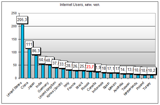 Сам факт возрастания интереса к Интернет-конференции не вызывает сомнений. Вместе с тем, опубликованные статистические данные не дают представления о том, сколько вопросов осталось «за бортом», знал ли о их существовании Президент. Не говоря уже о том, что за неделю сайт посетили чуть более миллиона пользователей. Напомним, что только в России по официальным данным проживает 143,682,757 граждан, из которых 23,700,000 являются пользователями Сети (см. табл. 1.1). Трудно представить, что Интернет-конференция Президента заинтересовала менее 5% от общего числа российских пользователей.