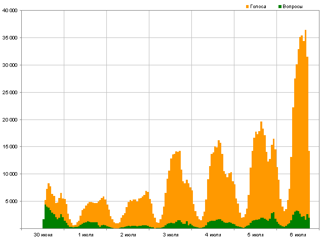 На графике (рис. 2.7), размещенном на http://president.yandex.ru/stats.xml показано, как по часам распределялась активность пользователей в задавании вопросов и в голосовании на протяжении всего времени интерактивной работы проекта.