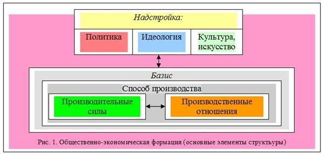 Общественно-экономическая формация(ОЭФ) – это "общество, находящееся на определенной ступени исторического развития, общество со своеобразным отличительным характером" . Основными характеристиками той или иной ОЭФ являются: (См.приложение) 1) способ производства; 2) социальная структура; 3) экономический базис; 4) политическая надстройка; 5) духовная жизнь. Важнейшее место среди них принадлежит способу производства – материальной основе жизни общества, опосредующей все остальные общественные процессы (социальные, политические, духовные). При этом основное противоречие каждой эпохи, заключающееся в возрастающем несоответствии между уровнем и характером развития производительных сил и производственными отношениями, приводит к качественному изменению способа производства и, соответственно, к смене ОЭФ. По мнению К. Маркса, в истории человечества произошла последовательная смена четырех ОЭФ: первобытнообщинной, рабовладельческой, феодальной и капиталистической. На смену капиталистической формации должна прийти коммунистическая. Рассмотрим более подробно основные этапы развития общества по К.Марксу: