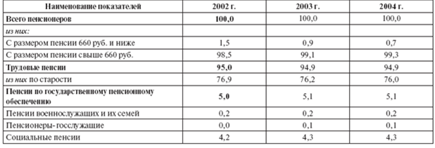Доля различных категорий пенсионеров в общей численности в 2002–2004 гг.