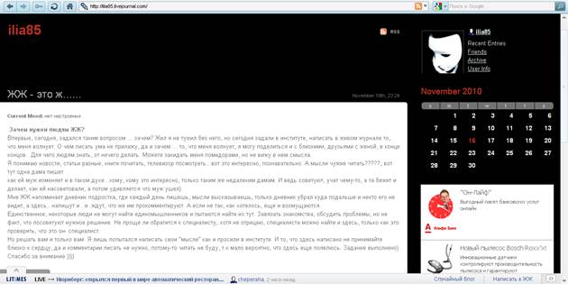 Мне ЖЖ напоминает дневник подростка, где каждый день пишешь, мысли высказываешь, только дневник убрал куда подальше и некто его не видит, а здесь...напишут и...и .ждут, что же им прокомментируют. А если не так, как хотелось, еще и возмущаются.