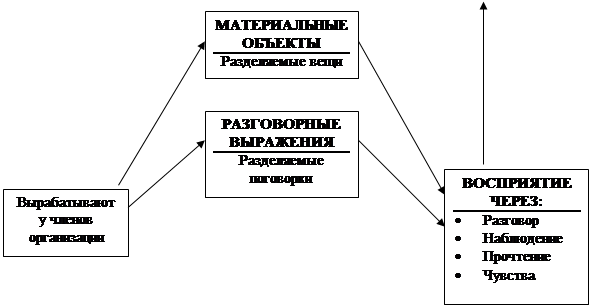 Члены организации, разделяя веру и ожидания, создают свое физическое окружение, вырабатывают язык общения, совершают адекватно воспринимаемые другими действия и проявляют понимаемые чувства и эмоции. Все это, будучи воспринятым работниками, помогает им понять и интерпретировать культуру организации, т.е. придать свое значение событиям и действиям и сделать осмысленным свое рабочее окружение. Поведение людей и групп внутри организации сильно связано нормами, вытекающими из этих разделяемых верований, ожиданий, действий.