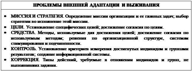 Процесс внешней адаптации и выживания связан с поиском и нахождением организацией своей ниши на рынке и ее приспособлением к постоянно меняющемуся внешнему окружению. Это процесс достижения организацией своих целей и взаимодействия с представителями внешней среды. В данном процессе решаются вопросы, имеющие отношение к выполняемым задачам, методам их решения, реакции на успехи и неудачи и т.д.