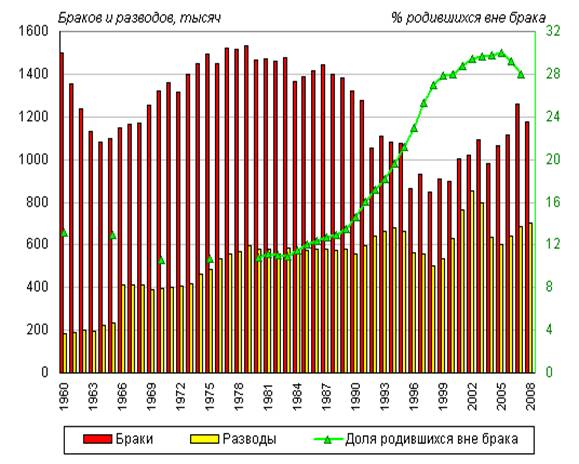 Число зарегистрированных браков и разводов (тысяч) и доля родившихся у женщин, не состоящих в зарегистрированном браке (%), 1960-2008