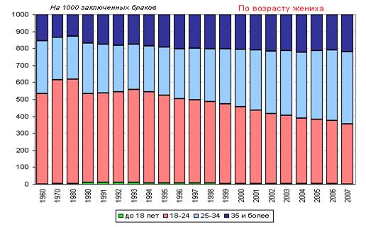 Более долговременной тенденцией является повышение возраста вступающих в официально регистрируемые браки, за которым может стоять как повышение возраста вступления в первый брак, так и повышение частоты официального заключения повторных браков. Начиная с 1994 года, устойчиво снижается доля браков, при вступлении в который возраст жениха и невесты не достигает 25 лет (рис. 1 и 2 в Приложении 3). Доля заключенных браков, в которых жених был моложе 25 лет, снизилась с 556 на 1000 браков в 1993 г. до 356 в 2007 г., а доля браков, в которых невеста была моложе 25 лет – с 665 до 524, соответственно. Доля «поздних» браков, заключенных в возрасте 35 лет и старше, несколько увеличилась только у мужчин (до 210-220), а у женщин оставалась сравнительно стабильной (150-160).