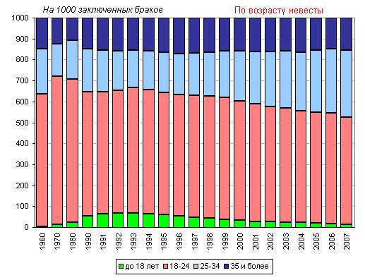Рис. 2. Распределение заключенных браков по возрасту невест, 1960-2007, на 1000 браков