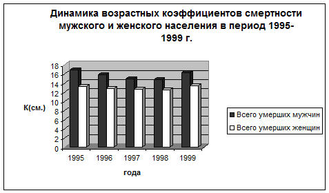 Из графика №1 (Приложение 2) “Динамика возрастных коэффициентов смертности мужского и женского населения в период 1995-1999 г.” видно, что женская смертность сегодня намного ниже, чем мужская. Мужская смертность всегда была высокой в России, но сейчас она особенно выросла и стала самой высокой в мире. Разница в ожидаемой продолжительности жизни между полами, составлявшая примерно 6 лет в 1938 - 39 гг. достигла 13 лет в 1993 г., на момент 1999 г. она составила 10 лет. На более ранних этапах в России, как и в других странах, различие между мужчинами и женщинами возрастали в результате увеличения влияния смертности в старших возрастах при снижающемся значении в детских и репродуктивных возрастах. После 1965 г. в России решающую роль в формировании разницы в ожидаемой продолжительности жизни между полами играет смертность трудоспособного населения. Мужская смертность в возрасте 15-59 лет объясняет 8 из 10 лет этой разницы в 1993 г. В других странах соответствующая величина составляет только 2 -3 года.