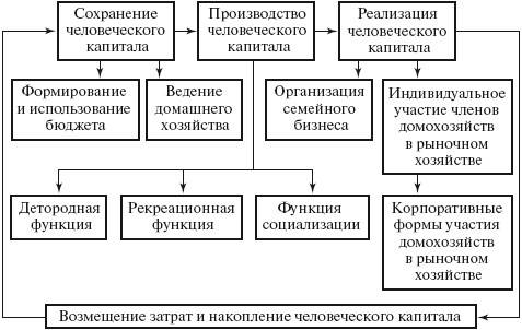 Основную функцию домашнего хозяйства следует определить как производство, реализация и сохранение человеческого капитала, который, в свою очередь, понимается как совокупность знаний, практических навыков и трудовых усилий человека. Представим деятельность домашнего хозяйства по формированию человеческого капитала с помощью схемы (рис. 1.1).