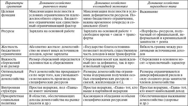 Следует заметить, что универсальной модели домашнего хозяйства не существует, так как характеристики институциональной среды, в которой это домохозяйство находится, оказывают влияние на его структуру. В этой связи разделяют три идеальных типа домашнего хозяйства (не существующих в чистом виде): домашнее хозяйство в командной экономике, домашнее хозяйство в рыночной экономике и домашнее хозяйство в переходной экономике.