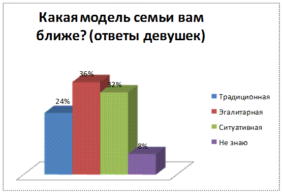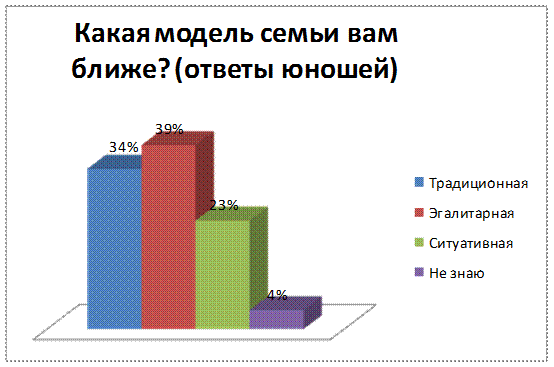 1) Рабочая гипотеза подтвердилась частично , потому что юноши ориентируются на псевдо традиционную модель семьи, с главенством мужа с ответственностью за материальное обеспечение, а девушки придерживаться псевдо эгалитарной модели, в которой было бы полное равенство загруженности бытовыми работами и в тоже время приписывали мужу традиционную обязанность содержать семью.