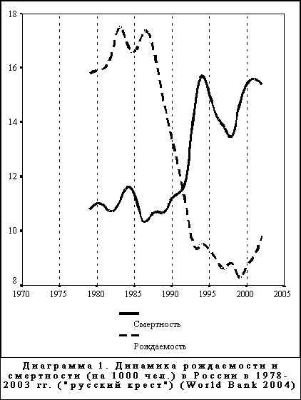 Постперестроечный период в России ознаменовался демографической катастрофой, получившей название «русский крест» [2, 3, 9]. С 1987 г. по 1993 г. рождаемость в стране сократилась с 2 до 1,3 ребенка на женщину (или с 17,2 до 9,4 родов на 1000 чел.). С 1986 по 1994 гг. смертность в России выросла с 10,4% (смертей на 1000 чел. в год) до катастрофического и аномального для сколь-нибудь развитых стран уровня 15%. В 1991-1992 гг. смертность сравнялась с рождаемостью, а вскоре и значительно превысила ее. Это означает убыль населения России, не компенсируемую иммиграцией. В Приложении 1 представлена динамика рождаемости и смертности (на 1000 чел.) в России в 1978 – 2003 гг. («русский крест») [9, с. 8 - 9].