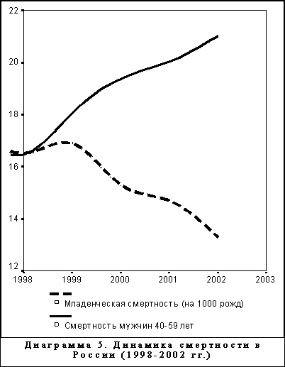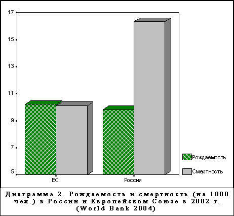 Высокая смертность является первостепенным источником депопуляции России. Рассмотрим рис. в Приложении 2 [4], где представлены показатели рождаемости и смертности в России и Европейском Союзе в 2002 г. Видно, что уровень рождаемости в обоих случаях приблизительно одинаков. Однако в ЕС в 2002 г. низкая рождаемость компенсировалось столь же низкой смертностью, благодаря чему здесь наблюдался даже некоторый естественный прирост населения. В России же именно катастрофическая смертность населения создает разрыв между рождаемостью и смертностью, который выливается в депопуляцию страны.