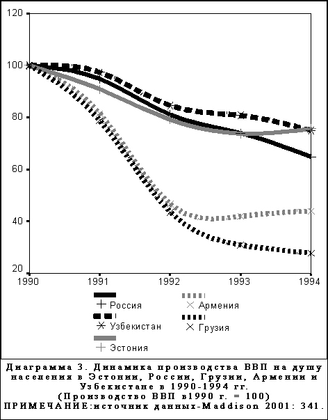 Экономический кризис в Армении и Грузии был значительно серьезнее, чем в России. Между 1990 и 1994 гг. производство ВВП на душу населения в России сократилось с $7762 до $5024, в то время как в Армении оно упало с $6142 до $2701, а в Грузии - даже с $7569 до $2100.