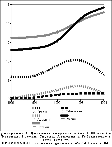 Масштабы экономического кризиса в постсоветских Эстонии и Узбекистане были примерно одного порядка - между 1990 и 1994 гг. в обеих странах производство ВВП на душу населения сократилось приблизительно на 25%. Стоит подчеркнуть, что в 1994 г. абсолютный уровень производства ВВП на душу населения в Эстонии ($8123) был более чем в два с половиной раза выше, чем в Узбекистане ($3199). Так как то же самое процентное снижение производства ВВП на душу населения в бедных странах ведет к несравненно более сильному росту смертности, чем в среднеразвитых странах, имеются все основания ожидать, что если постсоветский рост смертности был действительно вызван, прежде всего, экономическими причинами, то в 1990-1994 гг. смертность в Узбекистане должна была вырасти значительно сильнее, чем в Эстонии. В реальности все обстоит прямо противоположным образом. В Узбекистане в 1990-1994 гг. смертность выросла лишь на 8% (с 6,1 до 6,6%). За тот же самый период в экономически несравненно более благополучной Эстонии смертность выросла более чем на 20% и в 1994 г. достигла катастрофического уровня в 15,2%. К 1998 г. эстонская экономика вышла, в общем и целом, на докризисный уровень, в Узбекистане же производство ВВП на душу населения было все еще на 23% процента ниже уровня 1990 г. В то же самое время смертность в Узбекистане упала ниже докризисного (до 5,9%), а в Эстонии оставалась значительно выше его (на уровне 14%).