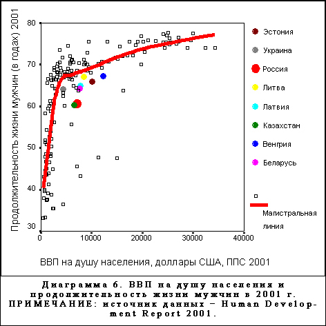 Обратим внимание, что экономическое движение России, Эстонии и других европейских стран бывшего Советского Союза после 1990 г. происходило именно в диапазоне ВВП на душу населения 3000-11000 долларов, то есть как раз в том диапазоне, где корреляция между экономическими показателями и продолжительностью жизни особенно слаба, что во многом и объясняет, почему экономическая динамика здесь оказала столь слабое воздействие на динамику смертности.