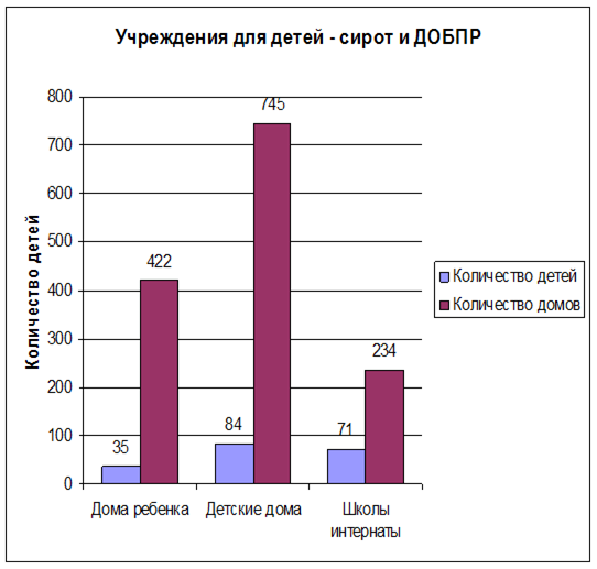 В настоящее время в стране 422 дома ребенка для 35 тыс. детей, 745 детских домов для 84 тыс. детей, 237 школ интернатов для 71 тыс. детей. В России ежегодно выявляется около 100 тыс. детей, нуждающихся в опеке. Дети-сироты или дети, брошенные родителями, попадают в дома ребенка позднее в детские дома и школы интернаты. Среди воспитанников школ интернатов 68% детей, родители которых лишены родительских прав, 8% детей одиноких родителей, 7% родителей, от которых отказались родители.