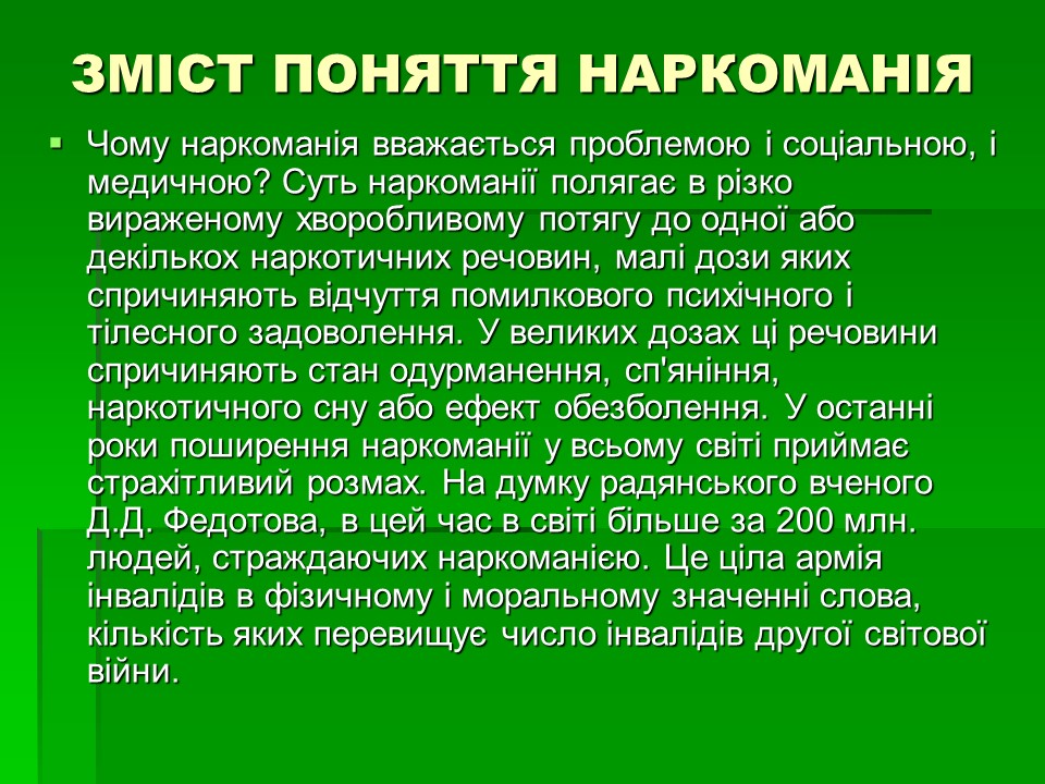- Чому наркоманія вважається проблемою і соціальною, і медичною? Суть наркоманії полягає в різко вираженому хворобливому потягу до одної або декількох наркотичних речовин, малі дози яких спричиняють відчуття помилкового психічного і тілесного задоволення. У великих дозах ці речовини спричиняють стан одурманення, сп'яніння, наркотичного сну або ефект обезболення. У останні роки поширення наркоманії у всьому світі приймає страхітливий розмах. На думку радянського вченого Д.Д. Федотова, в цей час в світі більше за 200 млн. людей, страждаючих наркоманією. Це ціла армія інвалідів в фізичному і моральному значенні слова, кількість яких перевищує число інвалідів другої світової війни.