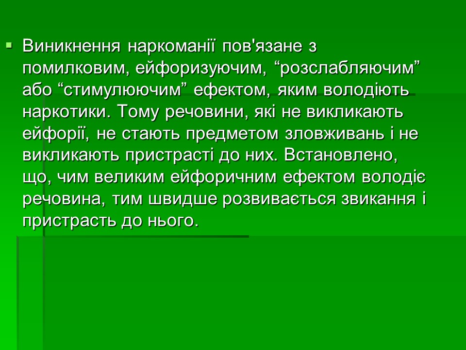 - Виникнення наркоманії пов'язане з помилковим, ейфоризуючим, “розслабляючим” або “стимулюючим” ефектом, яким володіють наркотики. Тому речовини, які не викликають ейфорії, не стають предметом зловживань і не викликають пристрасті до них. Встановлено, що, чим великим ейфоричним ефектом володіє речовина, тим швидше розвивається звикання і пристрасть до нього.
