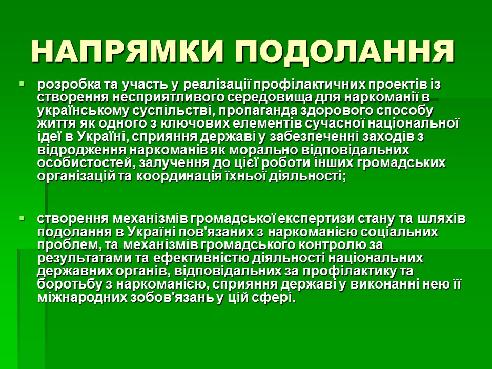 - створення механізмів громадської експертизи стану та шляхів подолання в Україні пов'язаних з наркоманією соціальних проблем, та механізмів громадського контролю за результатами та ефективністю діяльності національних державних органів, відповідальних за профілактику та боротьбу з наркоманією, сприяння державі у виконанні нею її міжнародних зобов'язань у цій сфері.