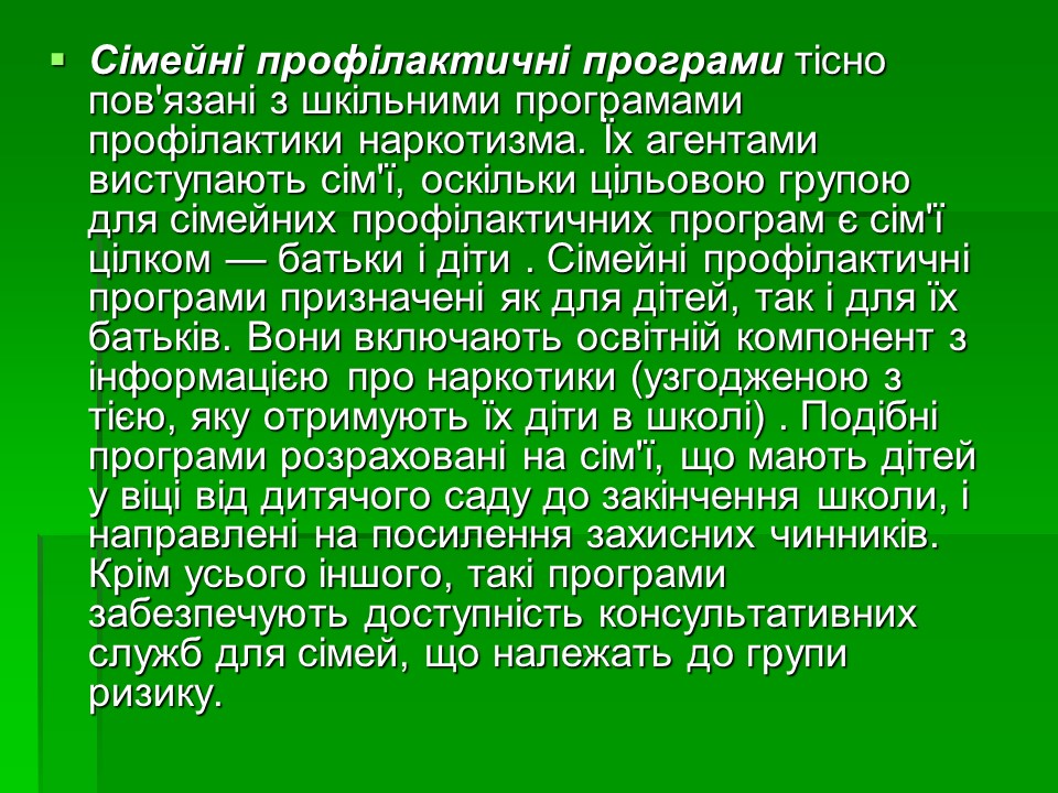 - Сімейні профілактичні програми тісно пов'язані з шкільними програмами профілактики наркотизма. Їх агентами виступають сім'ї, оскільки цільовою групою для сімейних профілактичних програм є сім'ї цілком — батьки і діти . Сімейні профілактичні програми призначені як для дітей, так і для їх батьків. Вони включають освітній компонент з інформацією про наркотики (узгодженою з тією, яку отримують їх діти в школі) . Подібні програми розраховані на сім'ї, що мають дітей у віці від дитячого саду до закінчення школи, і направлені на посилення захисних чинників. Крім усього іншого, такі програми забезпечують доступність консультативних служб для сімей, що належать до групи ризику.