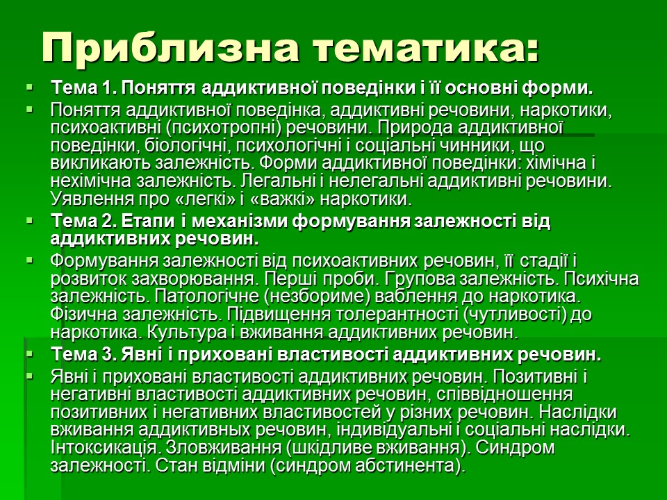 - Тема 3. Явні і приховані властивості аддиктивних речовин.