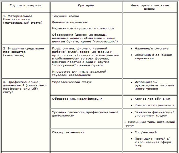 В таблице №1 представлены различные виды разделения на социальные общности и критерии их выделения, интересующий нас вид- Класс.