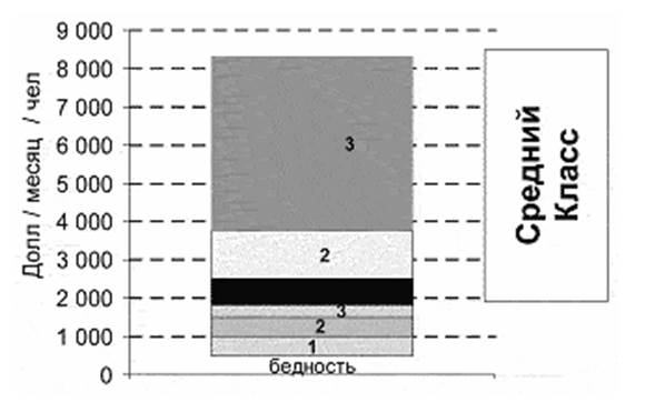 Средний Класс начинается от зарплаты хотя бы в 2 000 долл. в месяц или 1 000—1 400 долл. дохода на члена семьи. Ниже 500 долл. — бедность. Ниже 100 долл. — нищета (табл 3). Аналогичны, ±20%, показатели в Англии, Испании, Японии и других странах.