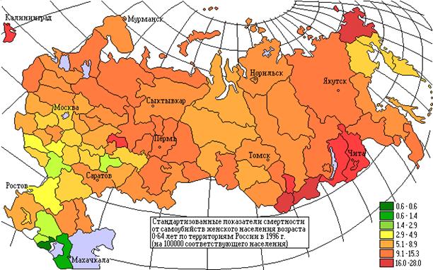 Максимальные показатели смертности от самоубийств зафиксированы на Европейском Севере (Пермская, Кировская и Архангельская области, республика Карелия), в Поволжье (республики Марий-Эл, Башкортостан, Удмуртия), на юге и северо-востоке Сибири (республики Бурятия и Алтай, Читинская область, Чукотский автономный округ), и Дальнем Востоке (Еврейская автономная область). В этих регионах смертность колеблется от 104 до 154 на 100000, превышая, таким образом, смертность в странах Центральной и Восточной Европы в 3-5 раз, в странах ЕС - в 5-7 раз.