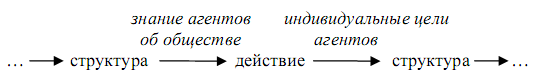 Структуры предопределяют характер индивидуальных действий потому, что агенты руководствуются знанием (научным или обыденным) об обществе, то есть о существующих условиях взаимодействия. Действия индивидов предопределяют характер социальных структур потому, что агенты преследуют собственные цели, то есть используют те правила и ресурсы, которые позволяют или дают шанс реализовать индивидуальные интересы.