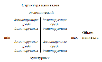 Исторически складывающаяся конфигурация полей, то есть их соотношение в жизнедеятельности людей, задает относительный «вес» капиталов различного вида при определении позиций и формировании диспозиций агентов в социальном пространстве. В современном обществе, в котором экономическое поле (производство, потребление, бизнес, работа) доминирует над другими полями, экономический капитал более «весом», чем культурный капитал, что предопределяет консерватизм большинства предпринимателей и рабочих и оппозиционность большинства интеллектуалов, образующих доминируемую фракцию внутри доминирующего слоя (см. рис. 2).