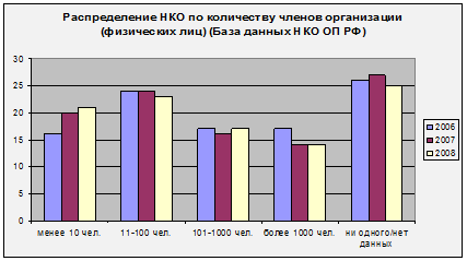 Превалируют организации со сравнительно небольшим числом членов (до 100 человек). Крупные по количеству членов НКО, включающие более 1000 человек, составляют около 14%.